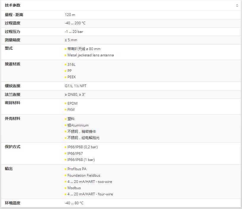 VEGAPULS 69是一種用于在不同工藝條件下連續測量散裝固體的傳感器。它是非常高的筒倉、大型燃料庫和分段容器中水平測量的理想選擇。由于非常好的信號聚焦,簡單的設置和可靠的測量得到了保證。VEGAPULS 69可以配備封裝塑料天線或集成在金屬法蘭中的透鏡天線。這使得能夠佳地適應不同的應用領域。困難的過程條件,如:的溫度、過壓或真空,對于物位計VEGAPULS 692來說完全不是問題:準確可靠地測量儲罐和過程容器內的物位。借助雷達技術物位計非接觸測量液體物位并連續提供高精度測量值。
